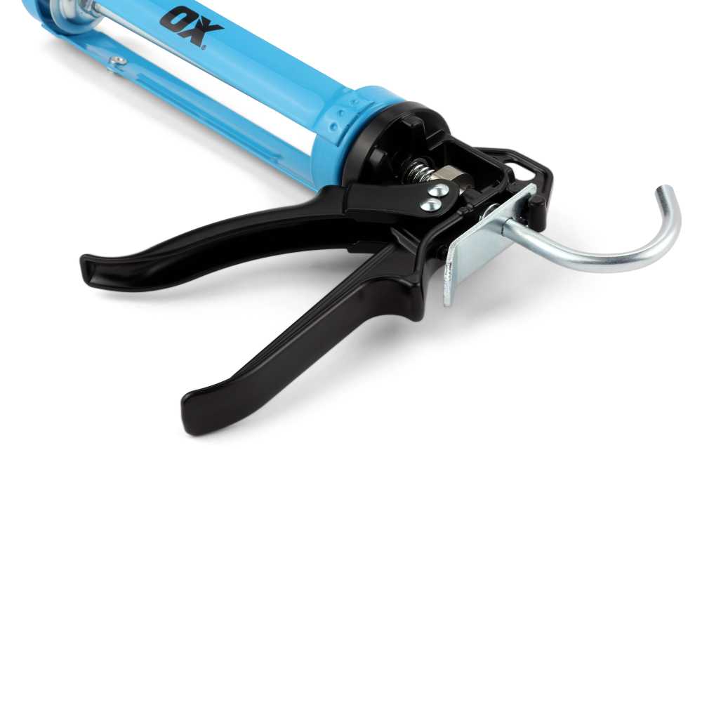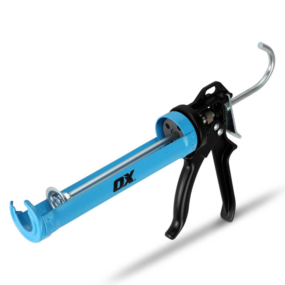 The OX Pro 10oz Heavy Duty Caulk Gun delivers powerful, controlled application with its 24:1 thrust ratio, making it perfect for high-viscosity sealants, adhesives, and silicones. The 360-degree rotating barrel provides effortless maneuverability, allowing you to adjust the angle for precision sealing in tight or awkward spaces.