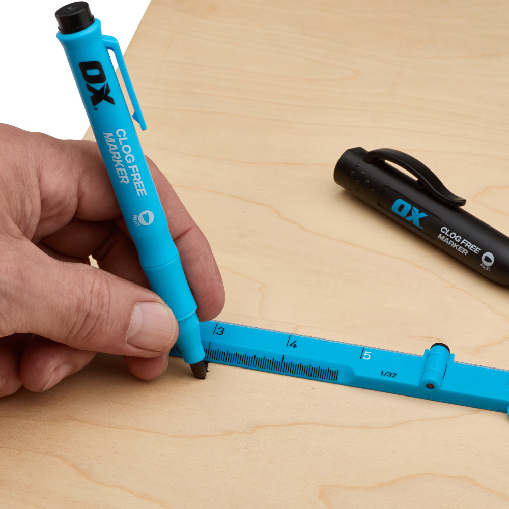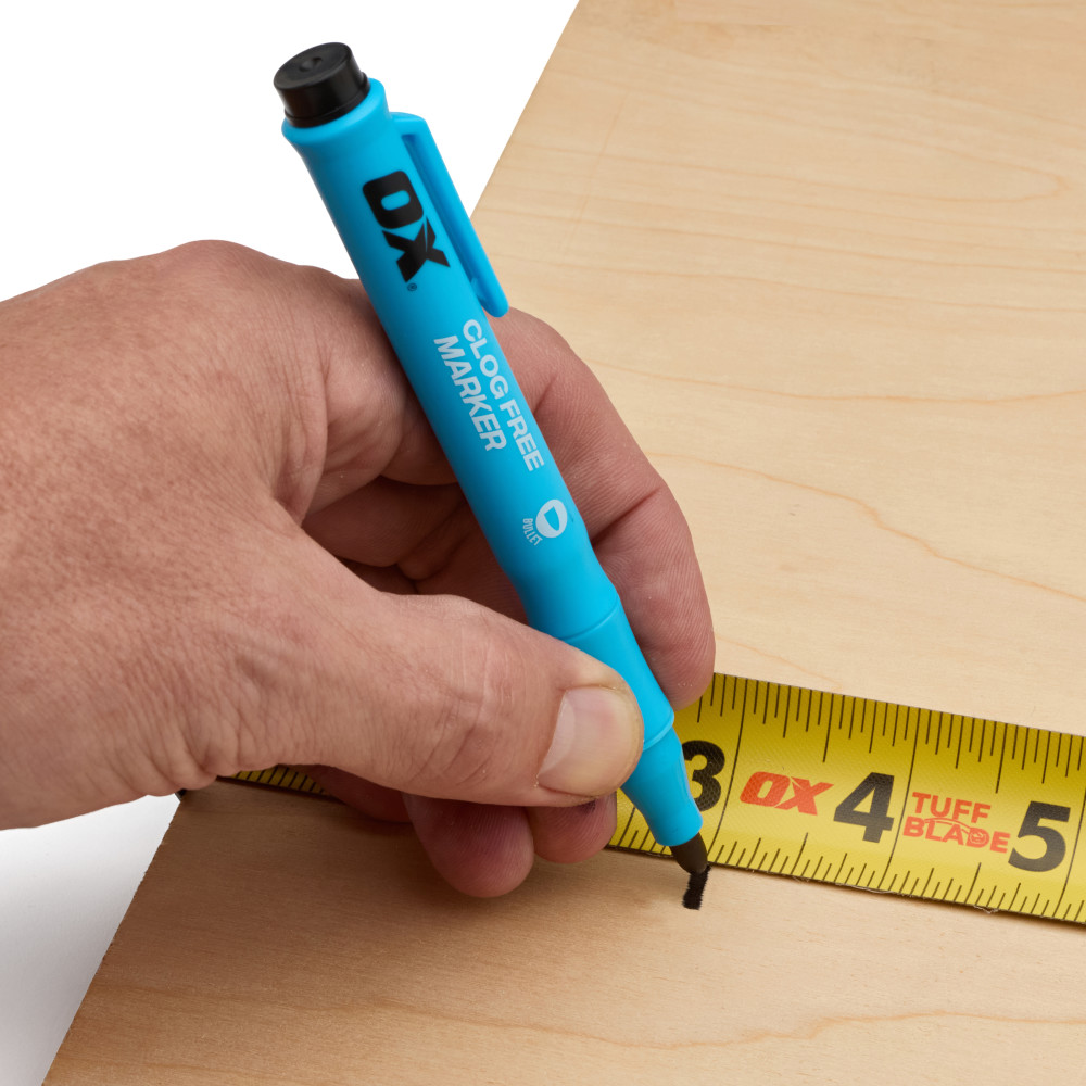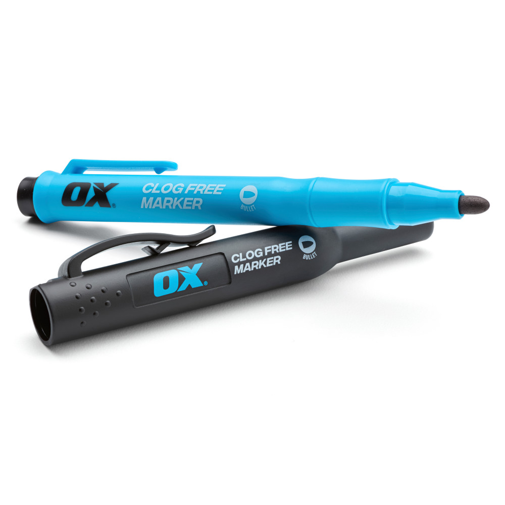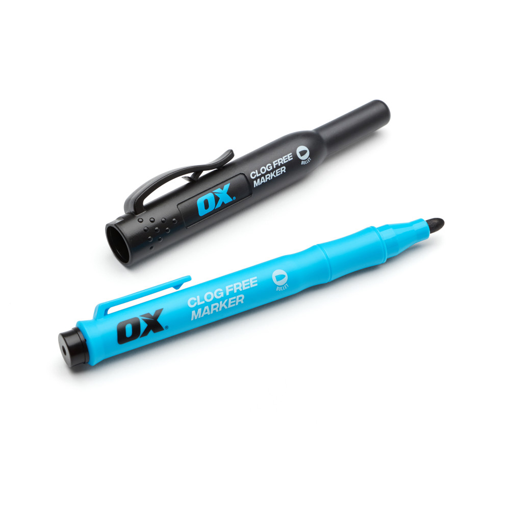 Built with the tradesman in mind, the OX Tools Clog-Free Permanent Construction Marker 2-Pack includes two durable black ink permanent markers with integrated holsters, designed specifically for high-performance marking on challenging surfaces. These black permanent markers are engineered to resist clogging; delivering clean, reliable lines even on dusty, rough, and shiny materials. The bullet-tip design ensures consistent application, making it easy to mark surfaces like tiles, PVC, metal, concrete, glass, timber, and more. Each marker’s rugged construction and clog-free technology make it ideal for the demands of construction work, where dust and debris are commonplace. The included pocket holster keeps the marker accessible and protects the tip for longer-lasting use, perfect for frequent marking needs across the job site. Built with professional-grade durability, these markers are designed to perform on varied surfaces, from textured to polished. The markers’ permanent ink provides high-contrast, visible marks that won’t fade, allowing tradespeople to rely on precise markings even on challenging or high-wear surfaces. OX Clog-Free Permanent Construction Markers are a practical permanent marking addition to every construction professional’s toolkit.