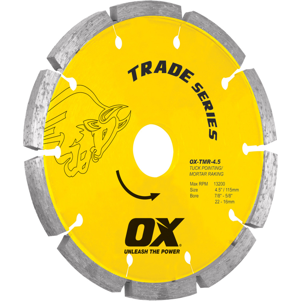 The OX TMR Trade Series Tuck Pointing Diamond a Blade provides an effective removal of mortar joints prior to re-pointing. with a 1/4-Inch segment width, the OX mortar rakes are designed to cope with removal of most joints widths.