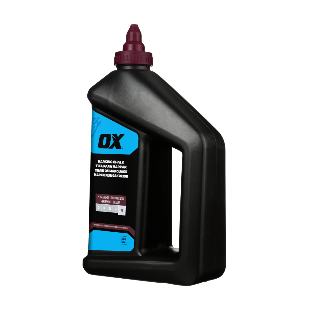 The OX Pro 1.1kg/2.5-lbs Hi-Permanence Crimson Red Marking Chalk delivers weatherproof, fade-resistant lines lasting up to 2 months. Ideal for outdoor use, it features a high-flow nozzle for smooth application and a leak-proof cap to prevent spills and clumping. Perfect for marking wood, concrete, and more, this durable chalk ensures precise, long-lasting results in tough conditions.