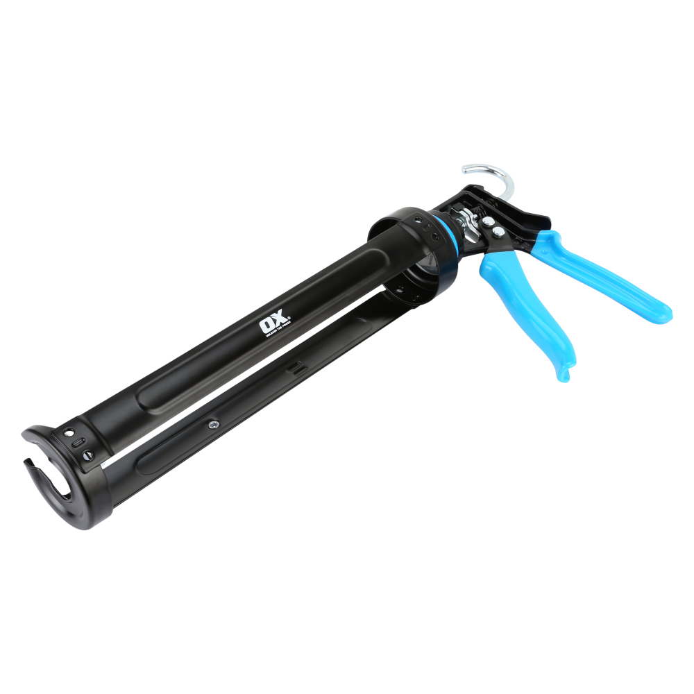 OX Tools Heavy-Duty Caulk Guns were designed with the tradesmen in mind. Packed with unique features, the OX Tools Pro 29oz Heavy Duty Caulk Gun makes caulking effortless and comfortable for all day use. The steel push rod mechanism provides a 12:1 thrust ratio for caulking materials. Silent squeeze mechanism prevents squeaking when activated, while still ensuring sufficient pressure.Our OX Grip handles are ergonomically designed and dipped in rubber, providing a comfortable and secure grip for all day use. The built-in poker is permanently attached and makes starting the caulking effortless. The adjustable dripless mechanism ensures that the caulk does not continue to flow, preventing a mess from being created.