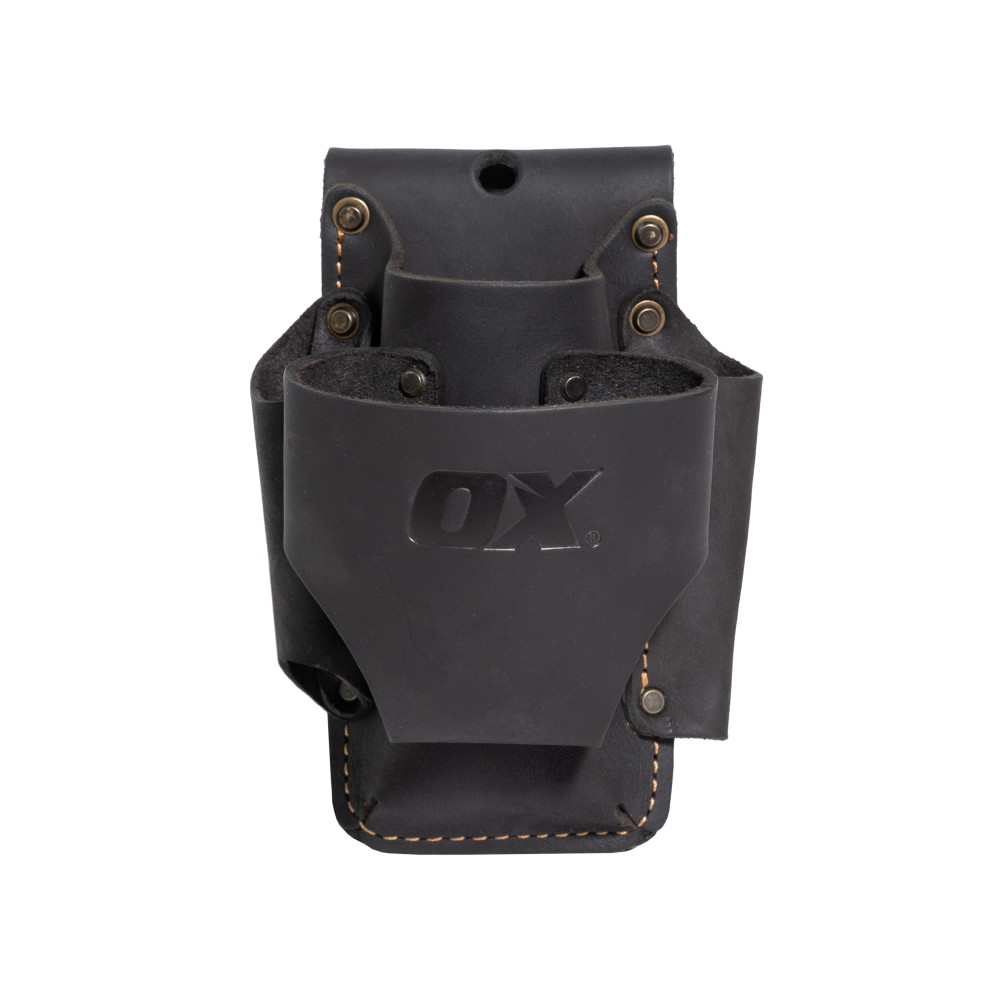 The OX TOOLS Pro Oil-Tanned Leather 4-IN-1 Tape Measure/Knife/Pencil Holder is tough and dependable. The tool storage accessory provides 4 times the tool capacity in the belt space of one holder. The holder allows the user to easily hold and access their most important tools. Constructed from top grain leather, the tool holder is made to take on even the roughest of jobsite conditions. The reinforced stitching in common stress points also enhances the general durability of the product. It is compatible with belts up to 3” in size and is perfect for any professional tradesman.