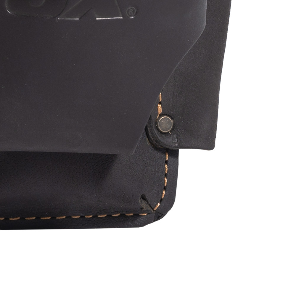 Built with the tradesman in mind, The OX TOOLS Pro Oil-Tanned Leather 4-IN-1 Tape Measure/Knife/Pencil is tough and dependable. The tool storage accessory provides 4 times the tool capacity in the belt space of one holder. The holder allows the user to easily hold and access their most important tools. Constructed from top grain leather, the tool holder is made to take on even the roughest of jobsite conditions. The reinforced stitching in common stress points also enhances the general durability of the product. The top grain leather construction of this accessory offers water and UV resistance providing undeniable durability and strength. It is compatible with belts up to 3” in size and is perfect for any professional tradesman.