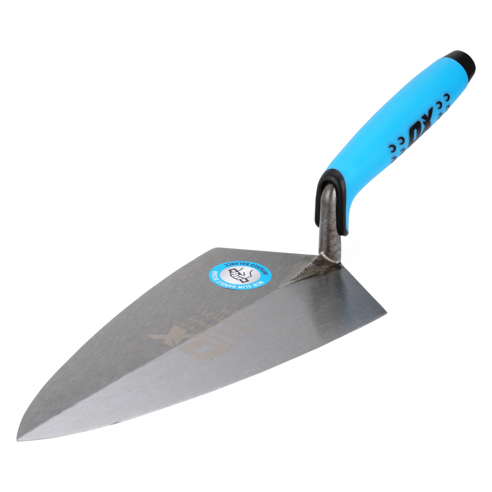 The OX Pro Philadelphia Pattern Brick Trowel features a durable one-piece forged steel blade and an OX Grip handle for a comfortable, non-slip hold. OX Tools brick trowels offer solid-forged steel blades, precision tapered ground blades, and OX Grip handles with finger protection, reducing fatigue.