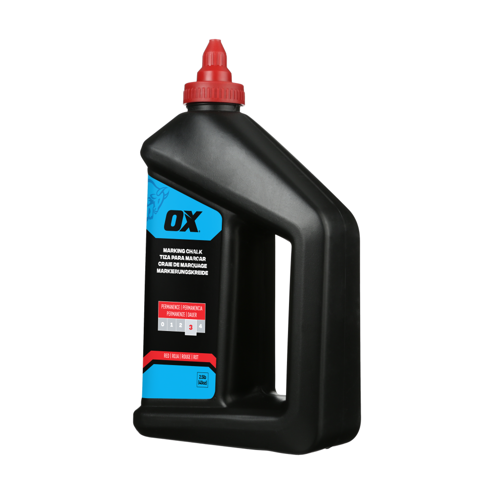 The OX Pro 1.1kg/2.5lbs Permanent Red Marking Chalk delivers durable, weatherproof lines that last up to 1 month. Featuring a high-flow nozzle and leak-proof cap, it ensures precise application and prevents clumping. Ideal for indoor and outdoor use on wood, concrete, metal, and more, this chalk offers long-lasting, high-visibility markings for tough job site conditions.