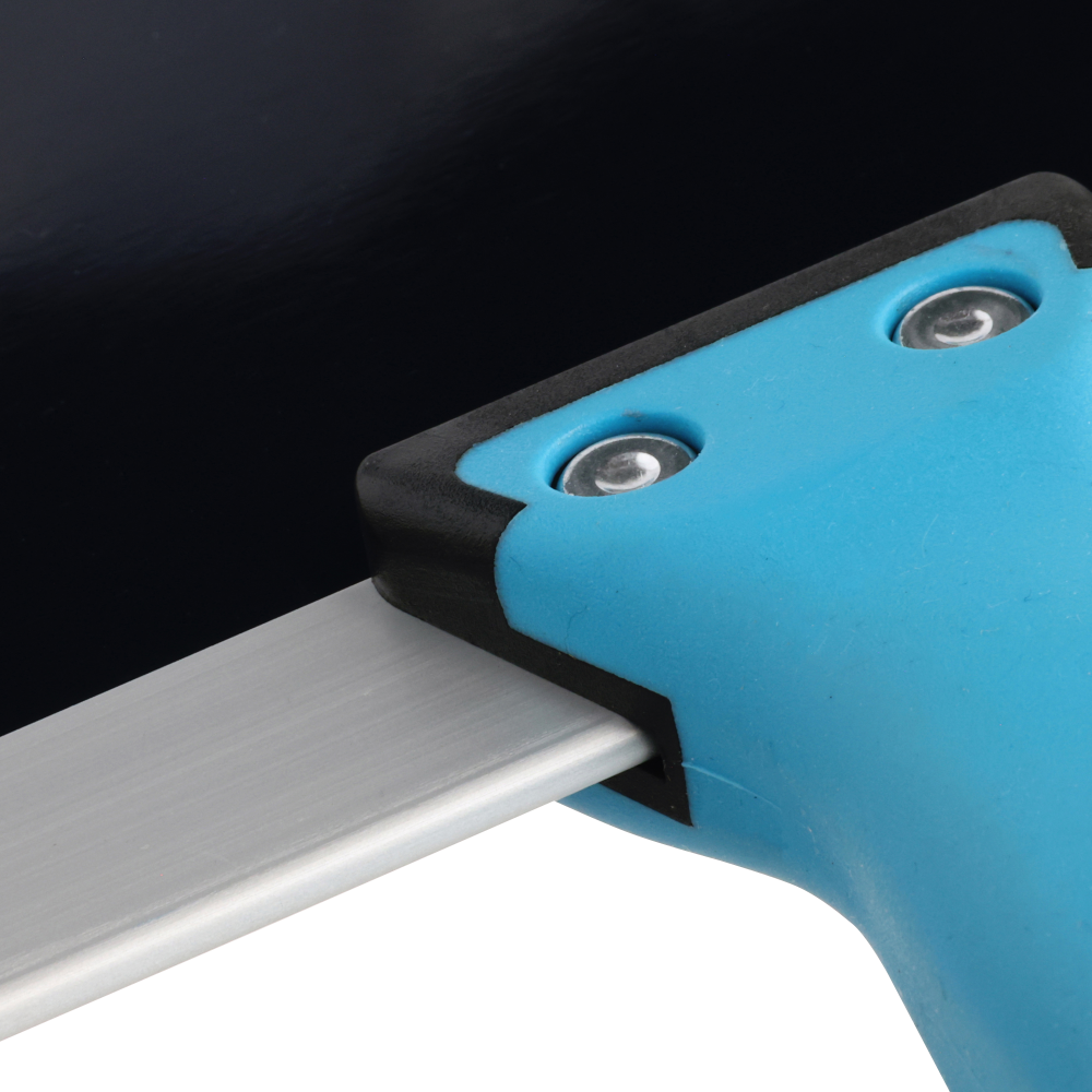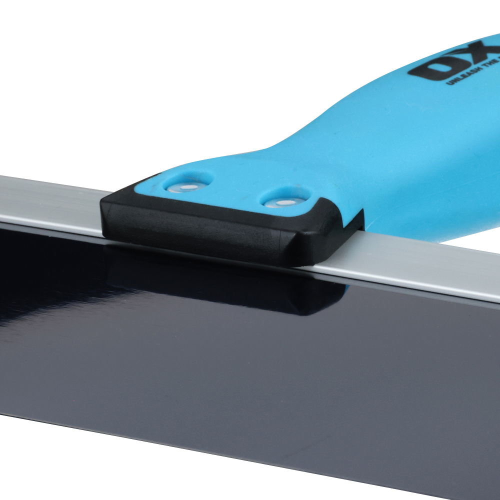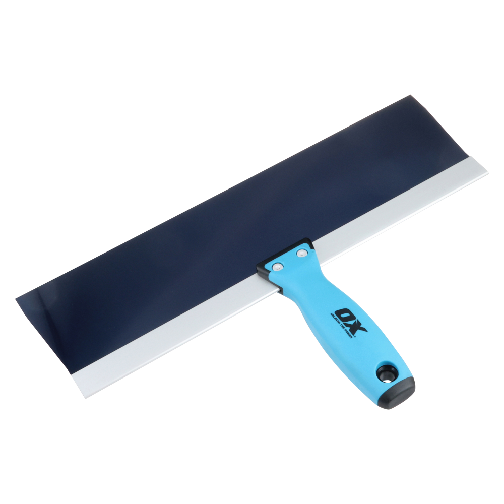OX Tools Blue Steel Drywall Taping Knife. Premium, flexible blue steel blade. Aluminum backer plate. Built-in hammer end. OX Grip handle. Blade and handle riveted together. For use in drywall joint taping, finishing, and patching.