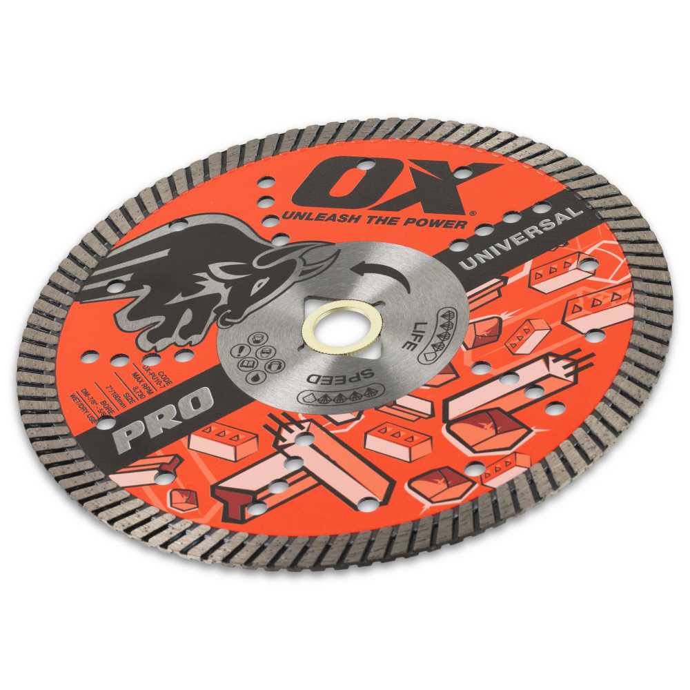 The OX OX Tools Pro Universal Diamond Blade is an award winning professional series blade that is guaranteed to cut granite, natural stone, clay products, engineering bricks, metal, concrete products, and all building materials. Designed for safety, while providing smoother quieter cuts, the reinforced center plate helps to reduce vibration while increasing user comfort. The OX Pro Universal Diamond Blades are simply the best value for money available in this sector, giving performance you would associate with a professional product at a price that has revolutionized the market. The PU10 blade is designed to work with angle grinders, circular saws, power saws, and Tile saws. There is no need to change blades when making a cut, because this blade is guaranteed to cut all materials on the jobsite.