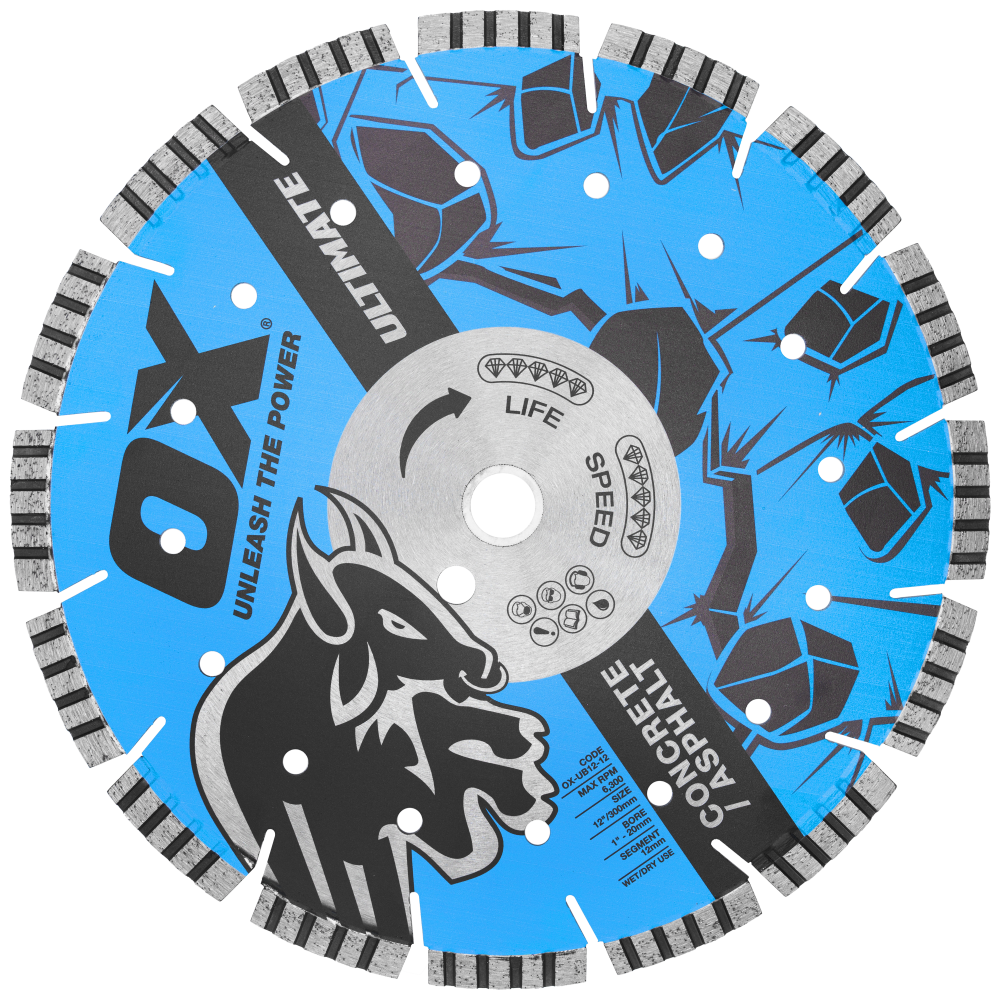 The OX Ultimate UB12 blade is designed to be the ultimate blade for asphalt, concrete, and reinforced concrete, and all other similar general building materials. The blades primary goal is to cut quickly and last longer than the competition. Steel Core and careful production processes make the blade safer to use long term.